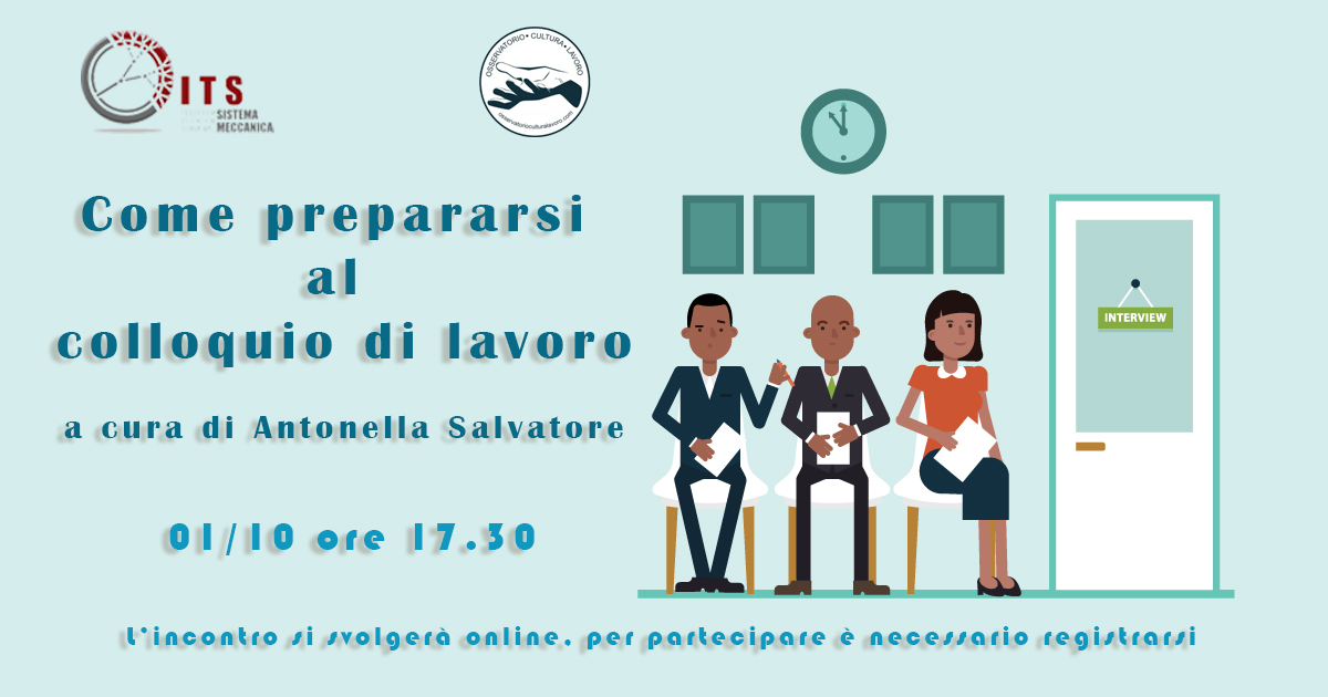 L’ITS Sistema Meccanica ha incaricato la prof. ssa Antonella Salvatore, Direttrice alta formazione e avviamento al lavoro, prof. John Cabot University, e fondatrice di Osservatorio Cultura Lavoro darà indicazioni su come affrontare un colloquio di lavoro e su come non farsi trovare impreparati di fronte a domande complesse. L’evento denominato “Come prepararsi al colloquio di lavoro”. Il webinar si terrà ONLINE, per accedervi è necessario prenotare un posto sul modulo: https://forms.gle/ZroNvLijP2dmKxCX9 successivamente saranno inviate le modalità di accesso, la piattaforma utilizzata sarà Google Meet. Inoltre le registrazioni si chiuderanno il 29 alle ore 9.00